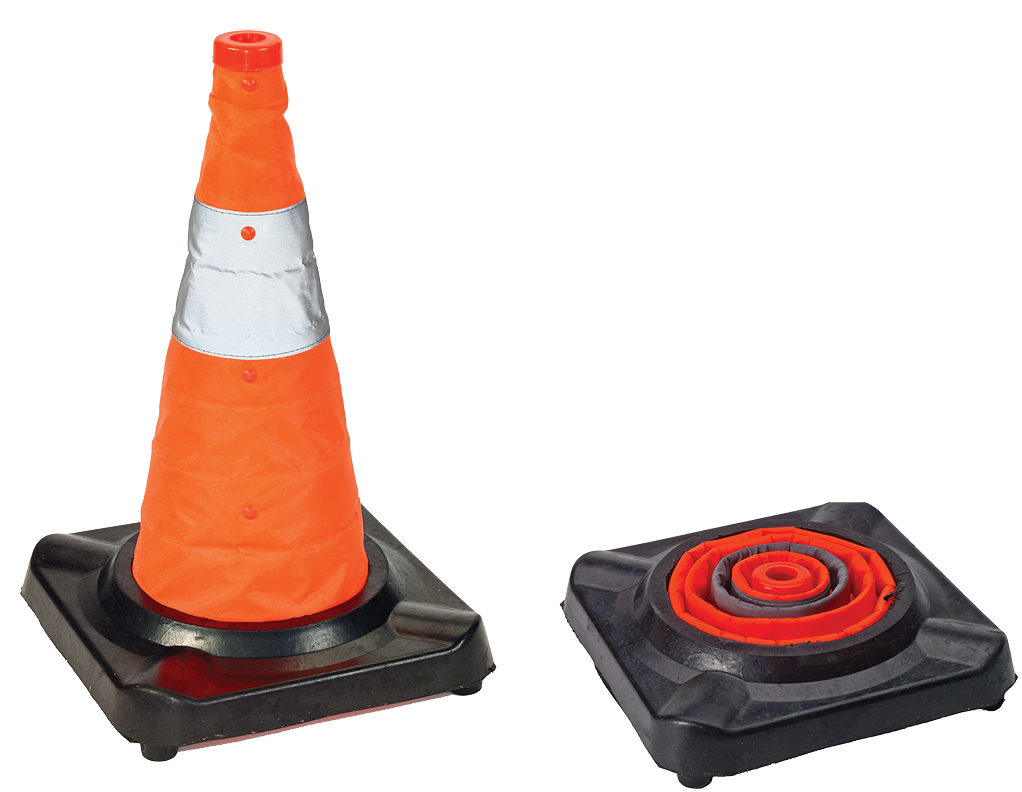 Collapsible traffic cones with heavy-duty rubber bases that resist moving from high winds or passing cars and trucks. Perfect for emergency responders, Fire/EMS or simply as an emergency kit for motorists.