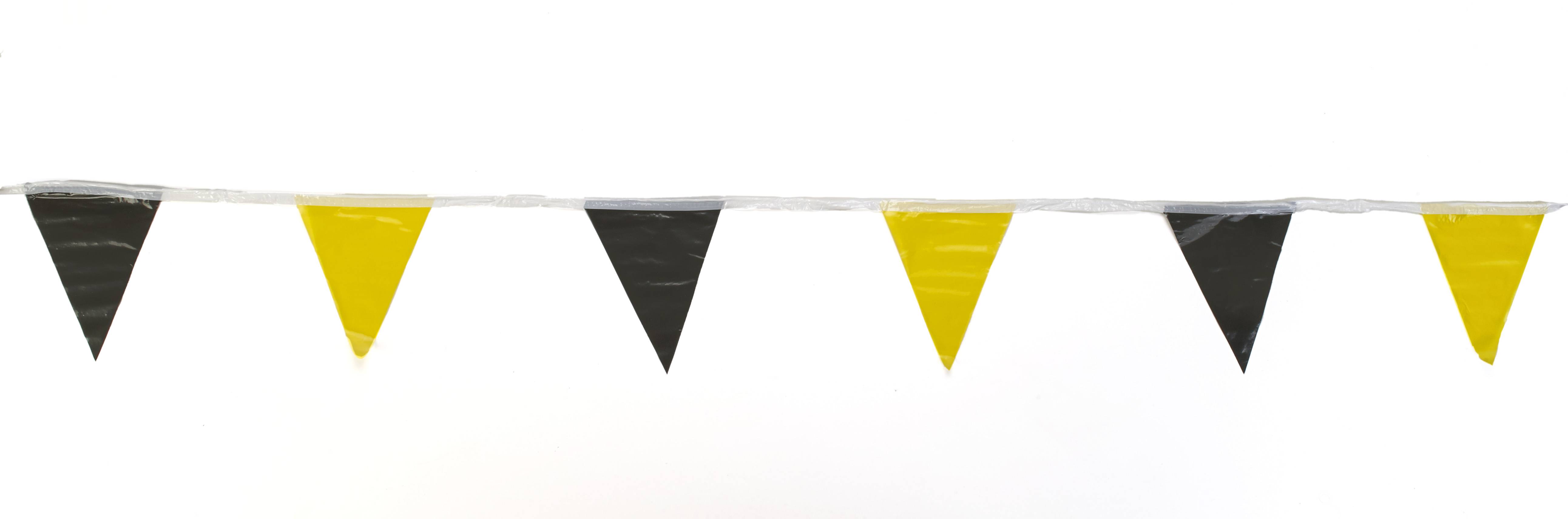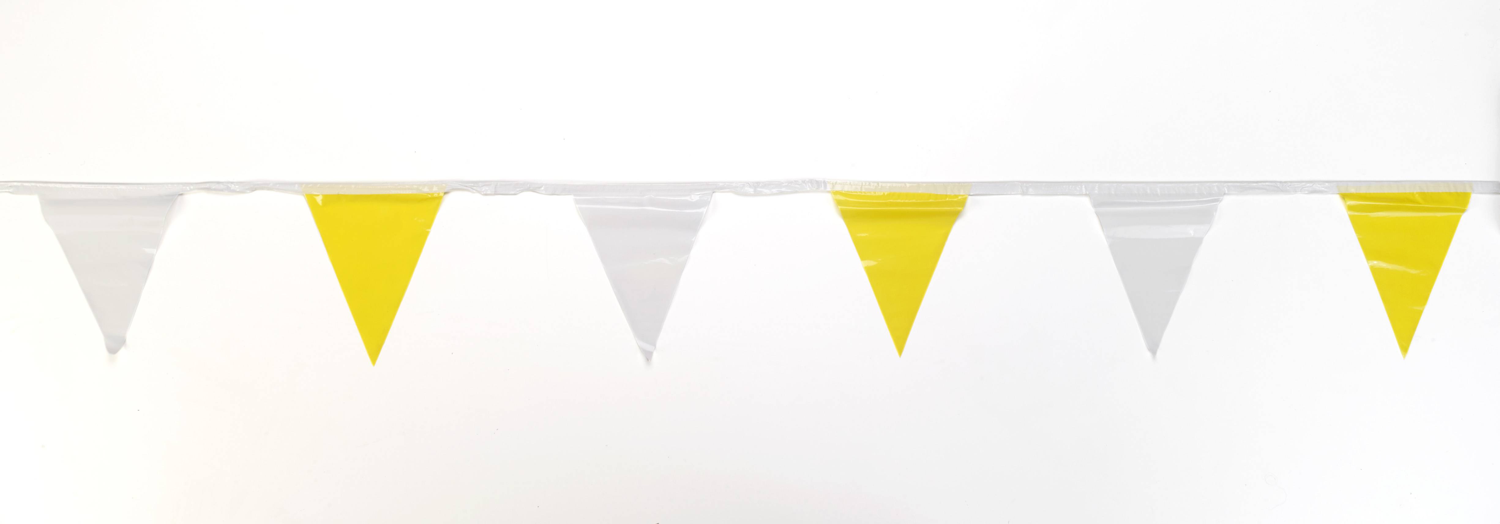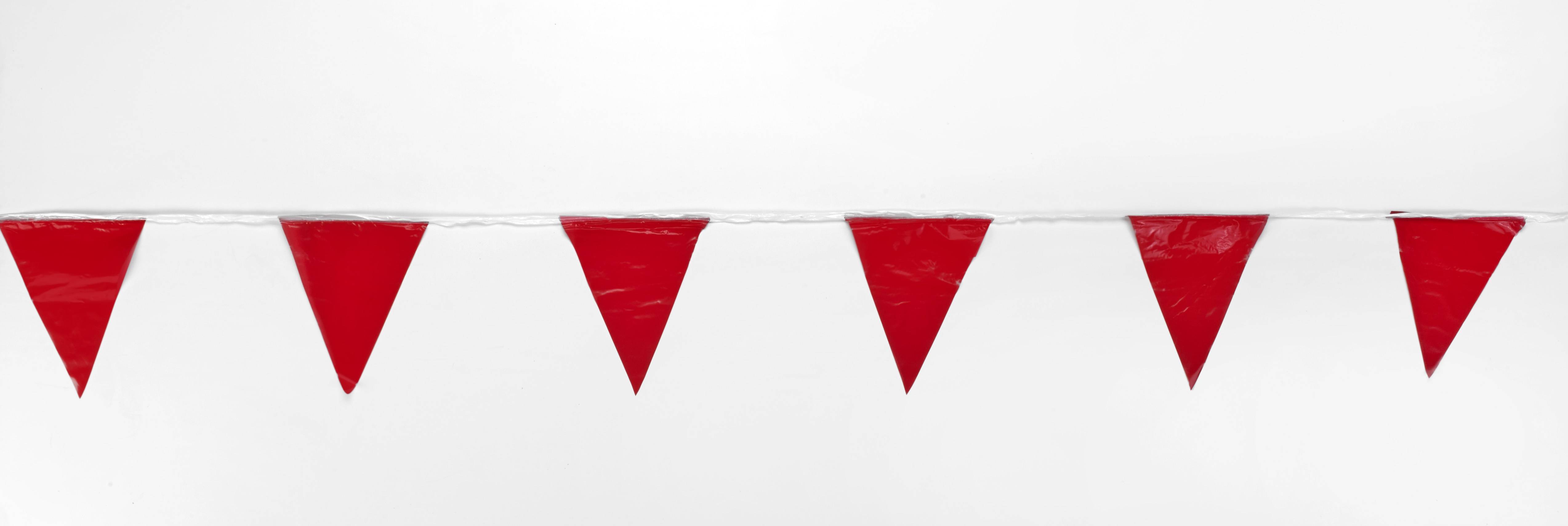 Our pennant flags come in 60’ long strings containing 36 brightly colored 9” x 12” pennants. Ideal for use at construction sites, scaffolding, wet floors, sporting events, grand openings, open houses, and other practical applications. The pennants are available in solid red, solid yellow, solid orange, red/white, yellow/white, orange/white, yellow/black, and a 6-color combination. 10 strands per box.
