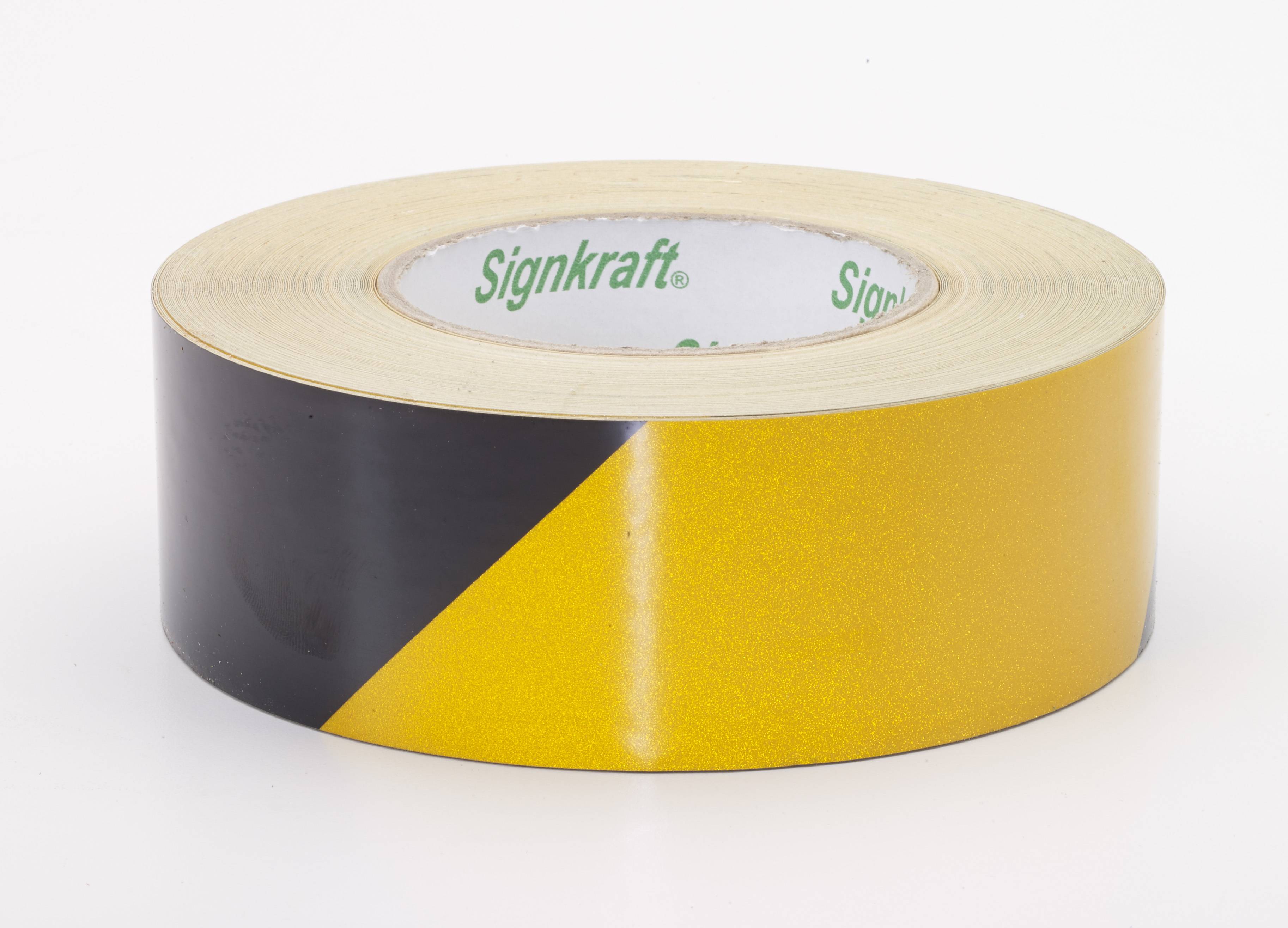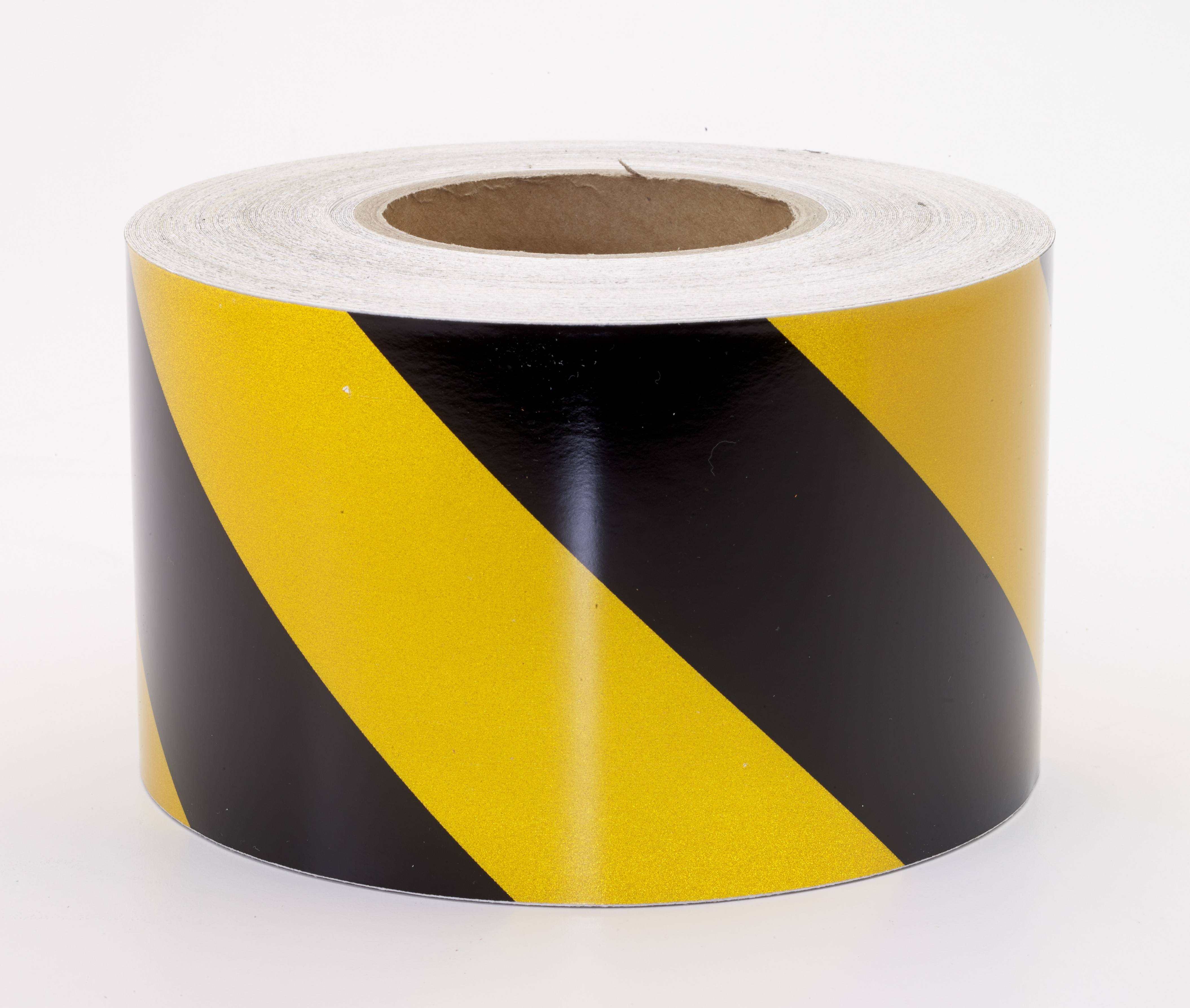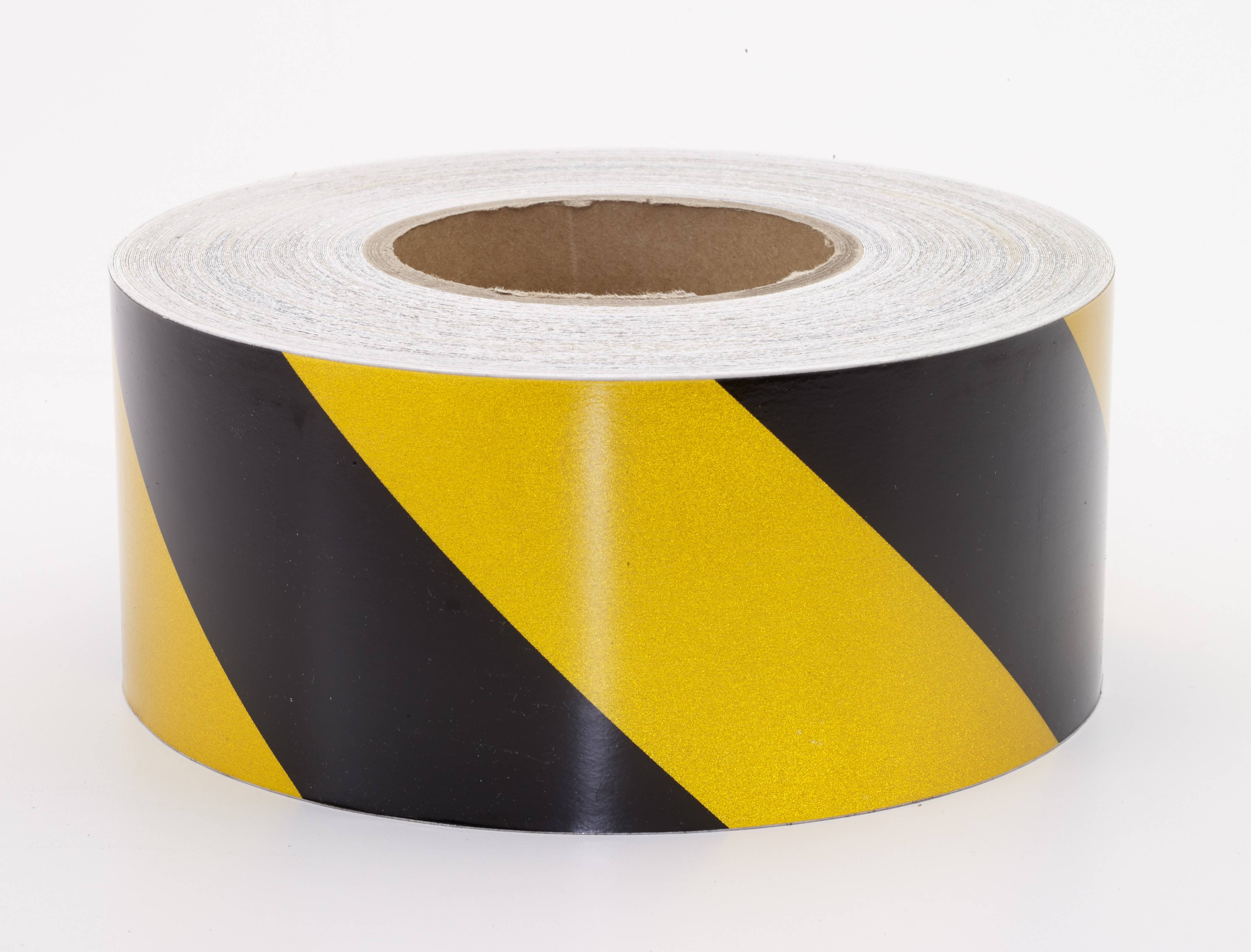 Reflective hazard stripe tape catches light and sends it back to the source for exceptional night time visibility. Available in 50 yard lengths 2”, 3”, and 4” widths.