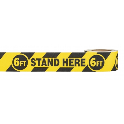43 prints per roll Peelable liner Durable surface eliminates slips Can also be applied to walls Promotes safety Adheres to most surfaces Highly visible Black on YellowMutual‚s Social Distancing Warning Anti-Skid Floor Tape clearly identifies where it is acceptable to stand with a continuously printed warning on pressure-sensitive tape with an anti-skid overcoat for added safety. This tape is made from a resilient vinyl material that will prevent slips, withstand heavy foot traffic, and adhere to most surfaces including hardwood, tile, laminate, sealed concrete, and other non-porous surfaces. Sold 4 rolls per case