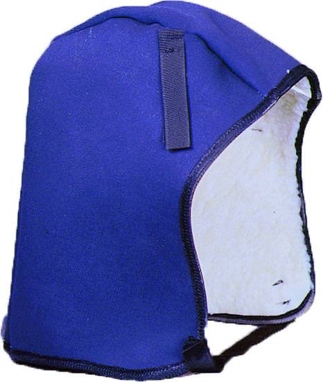 100% cotton twill shell with sherpa lining. Non-durable flame retardant. Three loop straps with adjustable Velcro closure. Long nape.