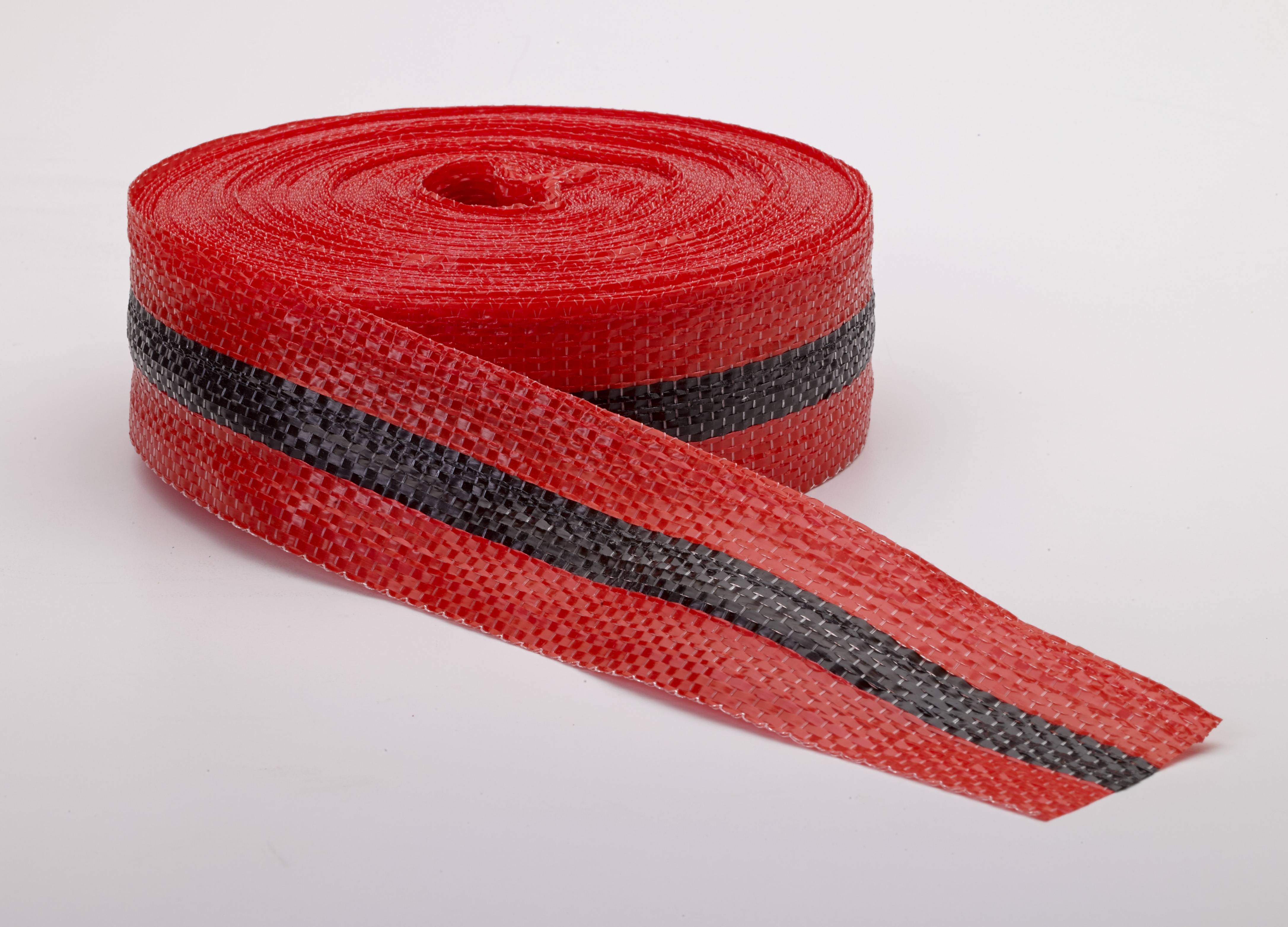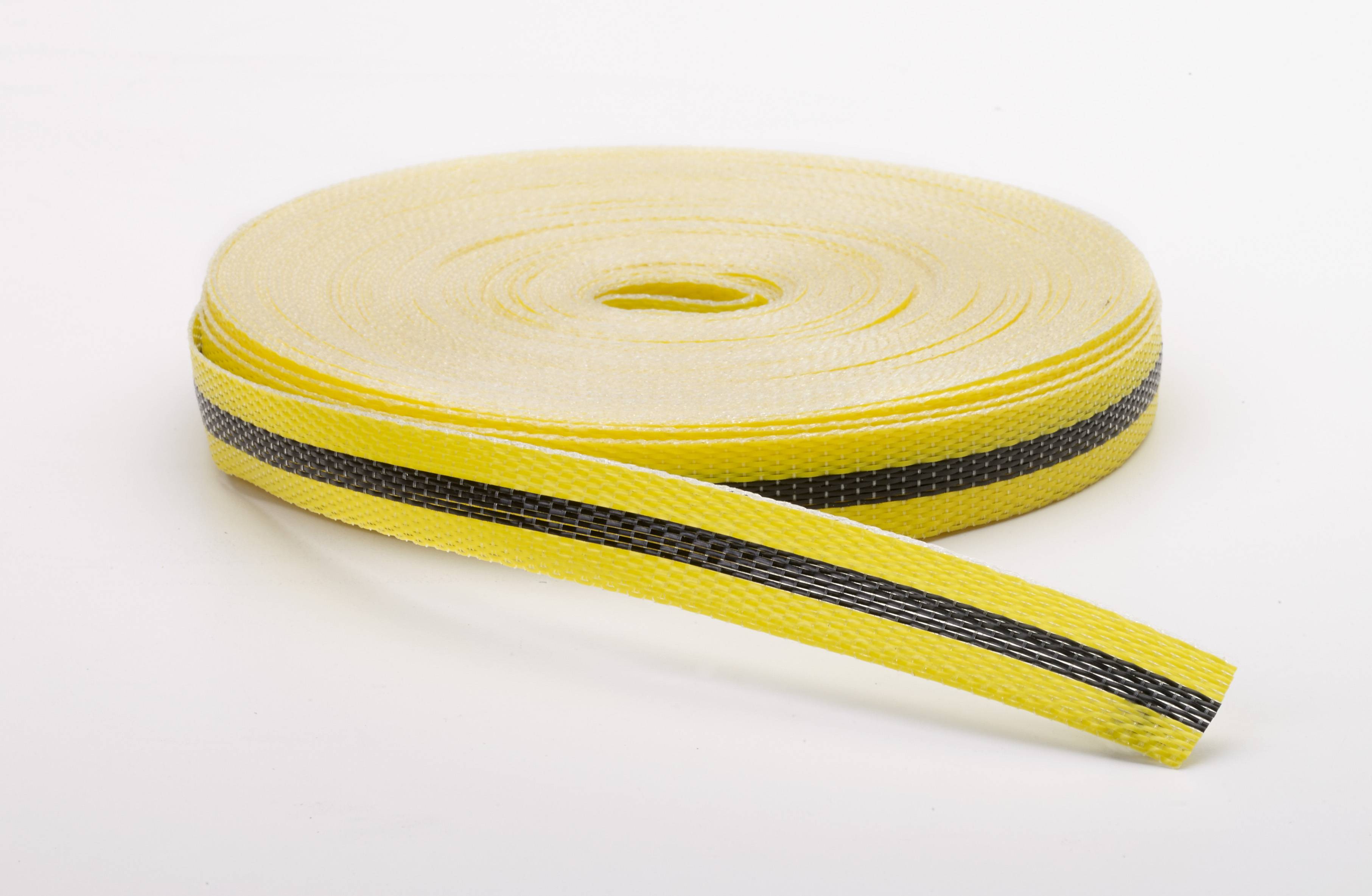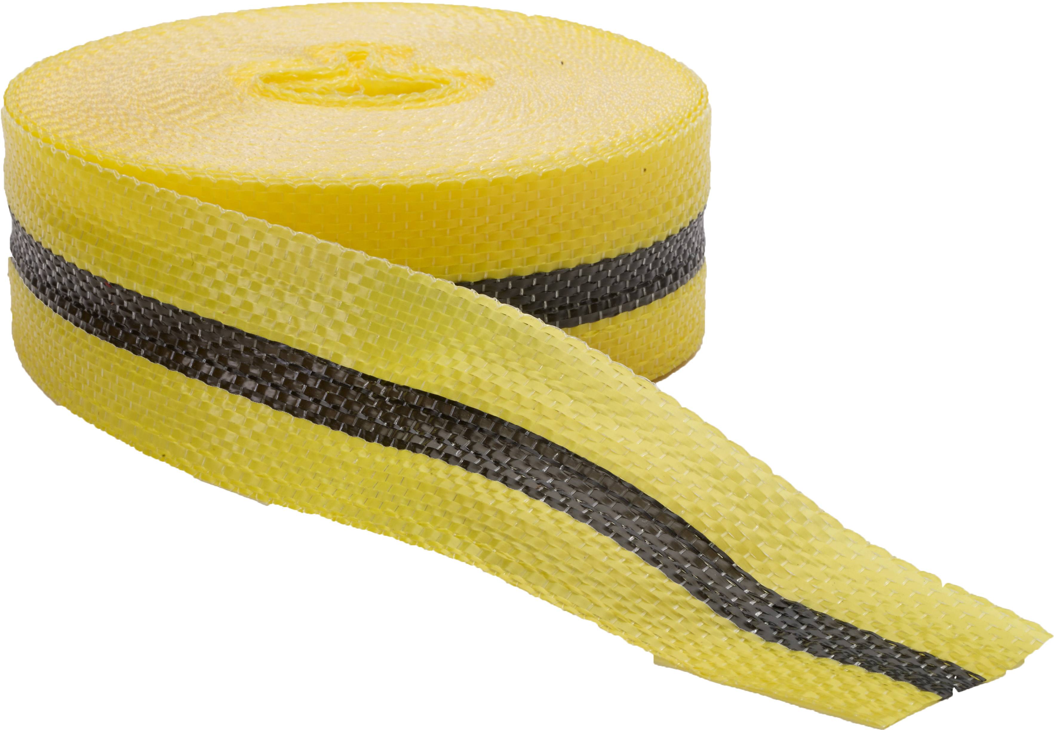 This Mutual product has a high tensile strength. The 3/4”x50yd rolls have 100lb tensile strength and the 2”x50yd rolls have 300lb tensile strength. Colors available are yellow/black/yellow, and red/black/red.
